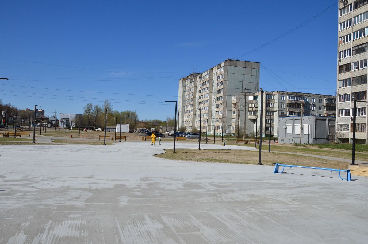 Уже завершена заливка бетонного основания для спортивной и детских площадок, в дальнейшем здесь уложат 1300 квадратных метров покрытия из резиновой крошки.
