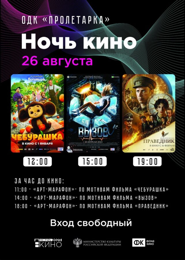 В 12:00 покажут фильм «Чебурашка» (6+), в 15:00 – «Вызов» (12+), а в 19:00 – «Праведник» (12+).