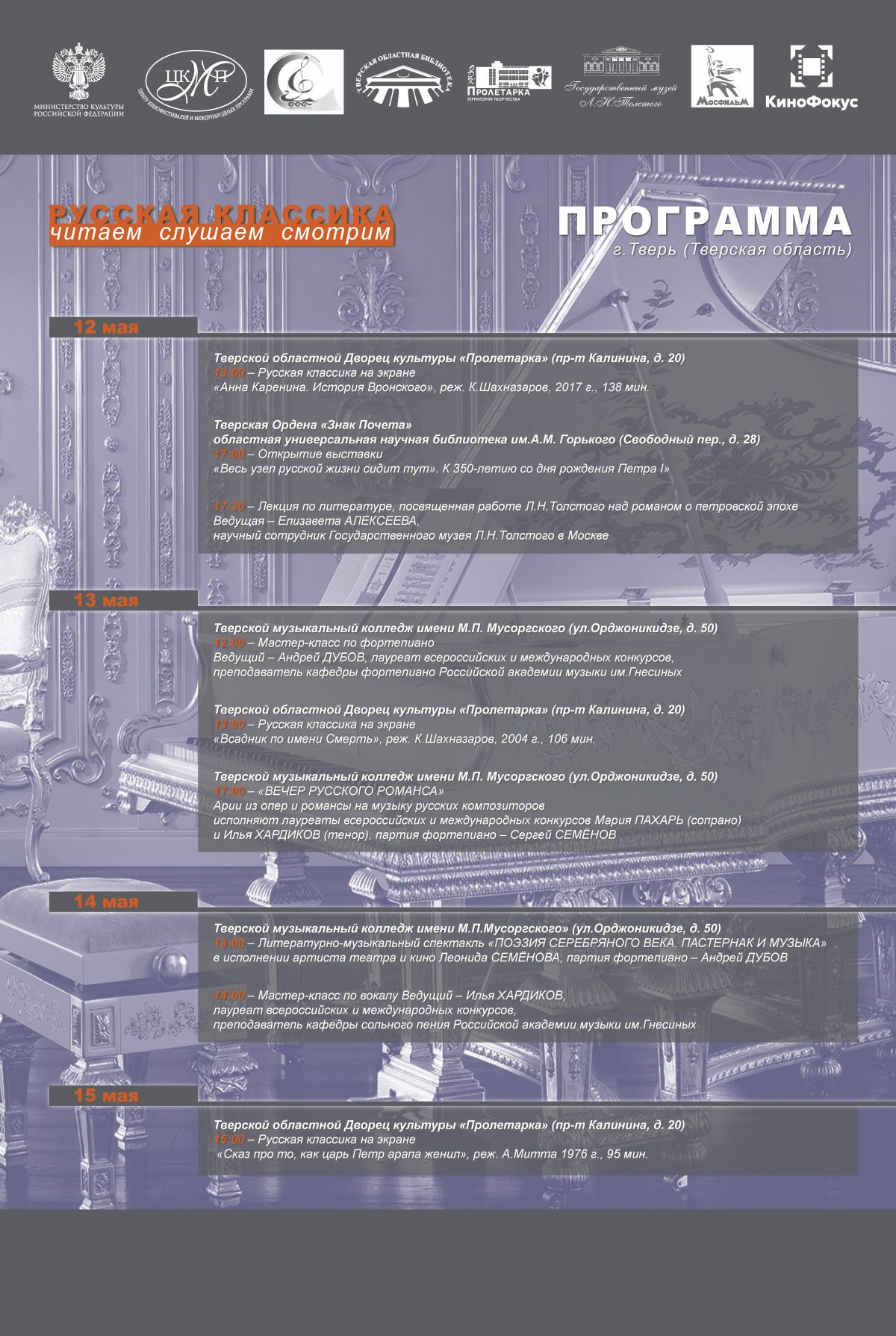 В дни проведения проекта в рубрике «Русская классика на экране» в Тверском областном Дворце культуры «Пролетарка» (проспект Калинина, 20) покажут фильмы из коллекции киноконцерна «Мосфильм»: «Анна Каренина. История Вронского», «Всадник по имени Смерть», «Сказ про то, как царь Петр арапа женил».