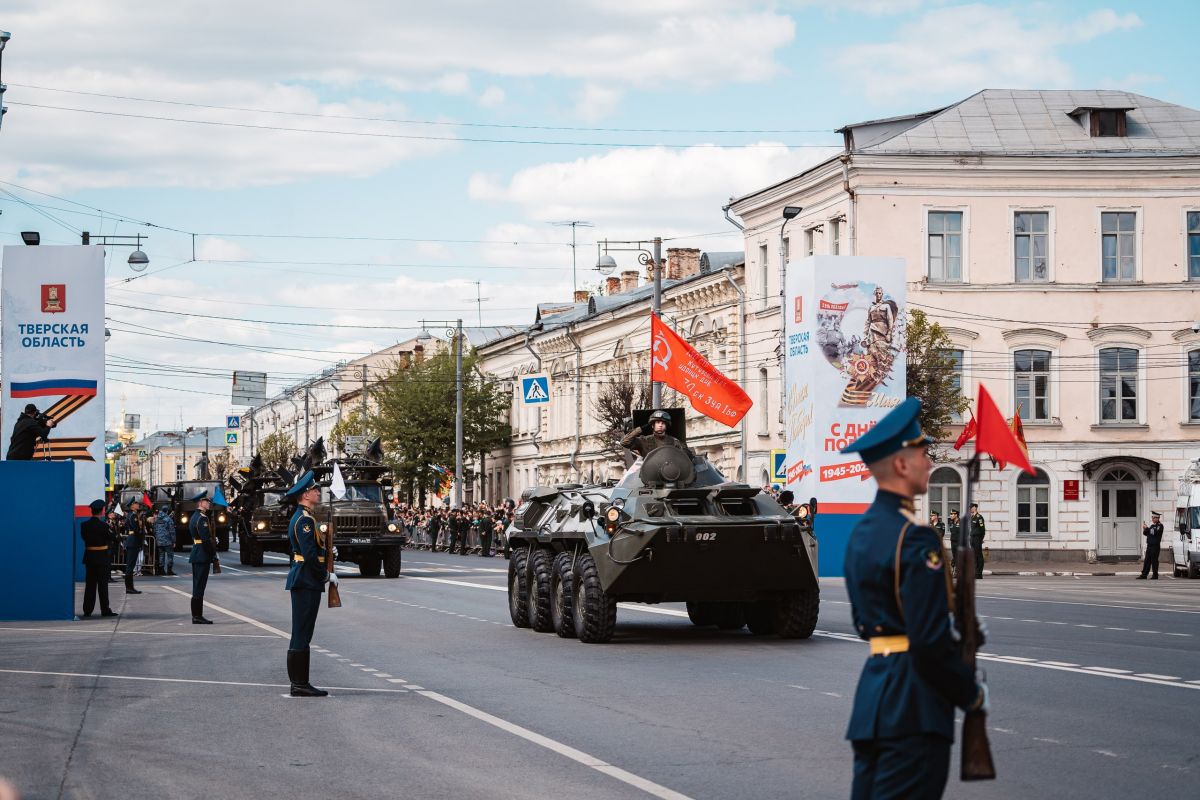По площади прошла боевая и военная техника Тверского гарнизона: бронетранспортер БТР-80, зенитные ракетные комплексы С-125, С-75 и С-200, пусковые установки зенитного ракетного комплекса С-300, радиолокационная станция 39-Н6 «Каста», система залпового огня «Торнадо С», установка ЗУ-23 для противовоздушной обороны и другие машины.