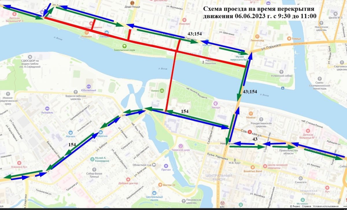 6 июня с 9:30 до 11:00 в связи с проведением городского общественного мероприятия будет временно ограничено движение транспорта по центральным улицам Твери.