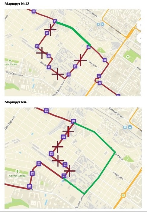 - движение автобусов маршрутов №12 будет осуществляться по улице Машинистов без заезда на улицы Карбышева, Светлая, Складская, Освобождения, Волоколамское шоссе.