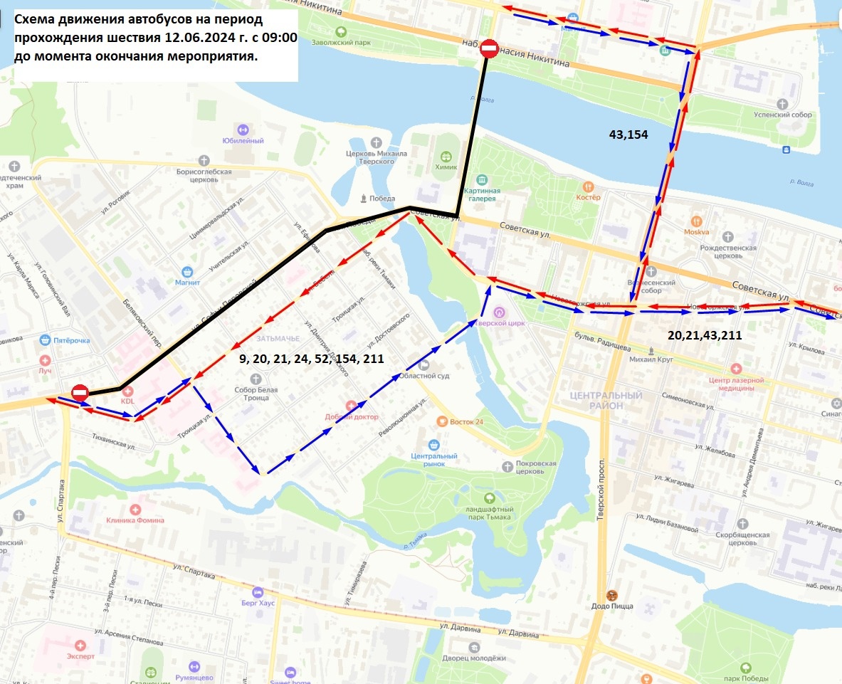 Схема движения автобусных маршрутов №9, №20, №21, №24, №43, №52, №154, №211 в этот период будет изменена.