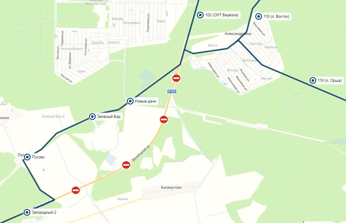 Автобусы будут следовать до остановочного пункта «Загородный-2», далее до деревни Пуково и по автодороге «Змеёво – Кушалино – Хохловка» до остановочного пункта «Поворот на Александровку», далее по своим привычным маршрутам. Также по изменённому пути будут следовать автобусы междугородных маршрутов в направлении населенных пунктов Бежецк, Максатиха, Весьегонск, Сандово, Кашин, Калязин, Кесова Гора и др.