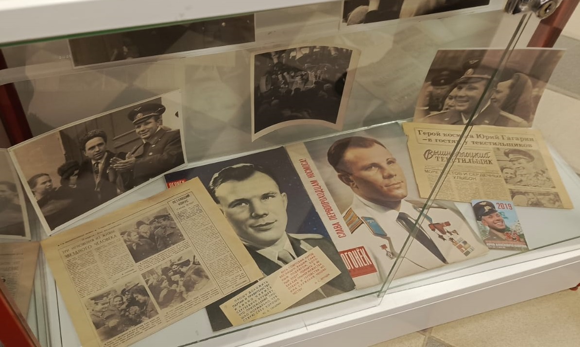 В экспозиции представлены предметы из фондовой коллекции музея: альбом с фотографиями А.Ф.Титова (переданный в музей его дочерью), автограф Юрия Гагарина на детской книге С. Михалкова (дар В.А. Просвирина), рисунок Н.В. Наливайко, выполненный карандашом, газеты за апрель 1964 года «Вышневолоцкий текстильщик», «Вышневолоцкая правда» и другие предметы.