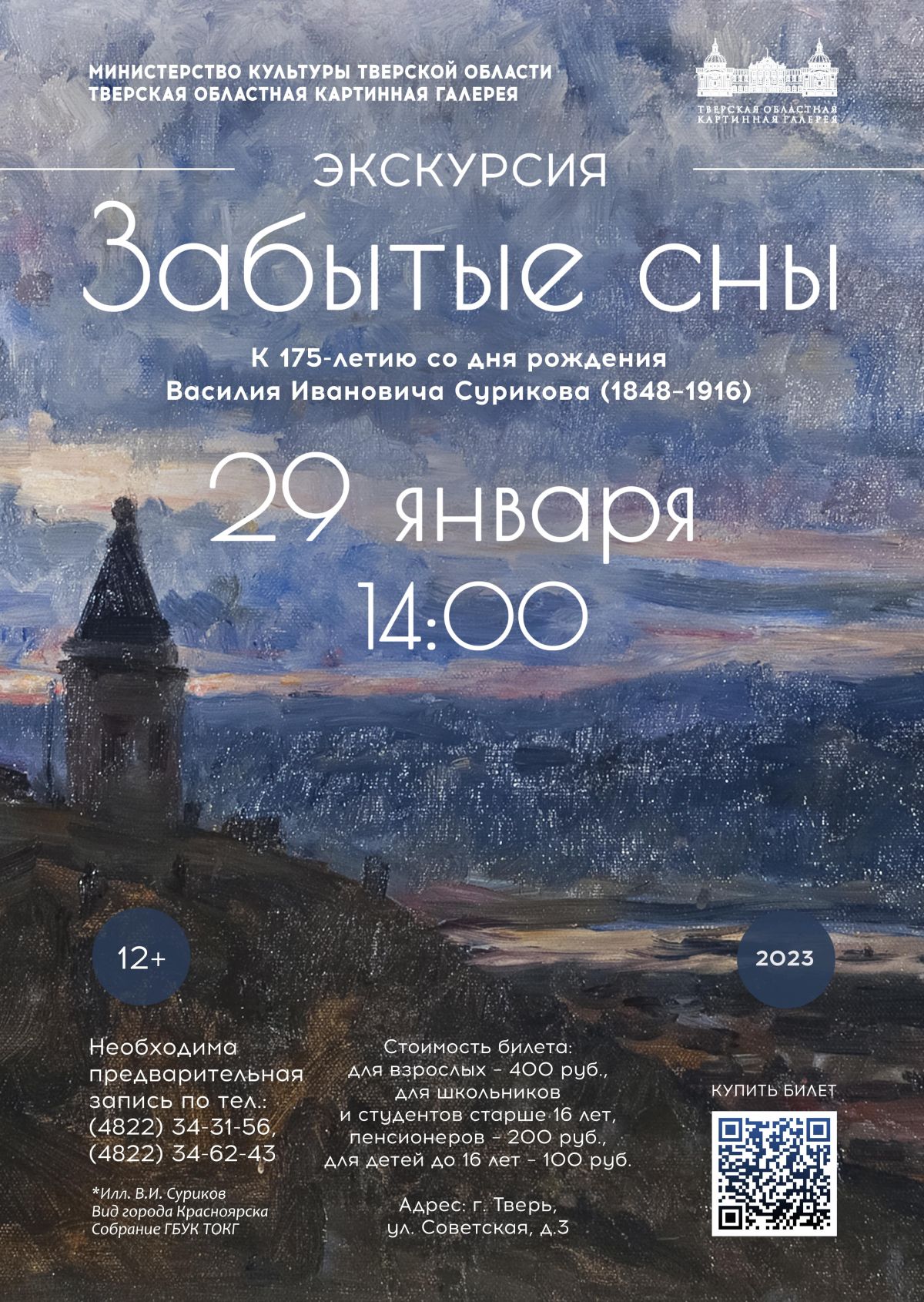 В экспозиции галереи в Тверском императорском дворце находятся несколько работ Василия Сурикова, среди которых этюды к известным полотнам «Утро стрелецкой казни» и «Степан Разин». Специально для экскурсии будет экспонироваться графическая работа мастера – рисунок «Юродивый», этюд к картине «Боярыня Морозова» (1886).