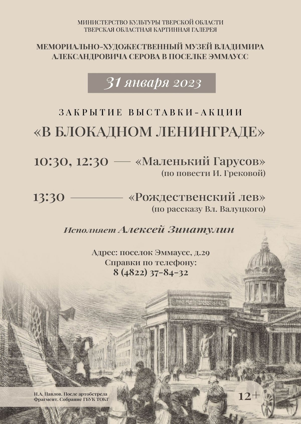 В 10:30 и 12:30 покажут спектакль «Маленький Гарусов» (по роману И. Грековой). Спектакль показывает горькое детство в блокадном Ленинграде.