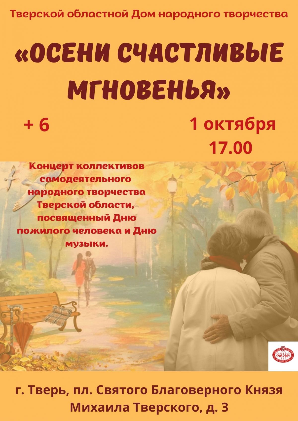 Жителей и гостей Твери будут ждать выступления коллективов самодеятельного народного творчества Тверской области. Посвящён концерт Дню пожилого человека и Дню музыки.