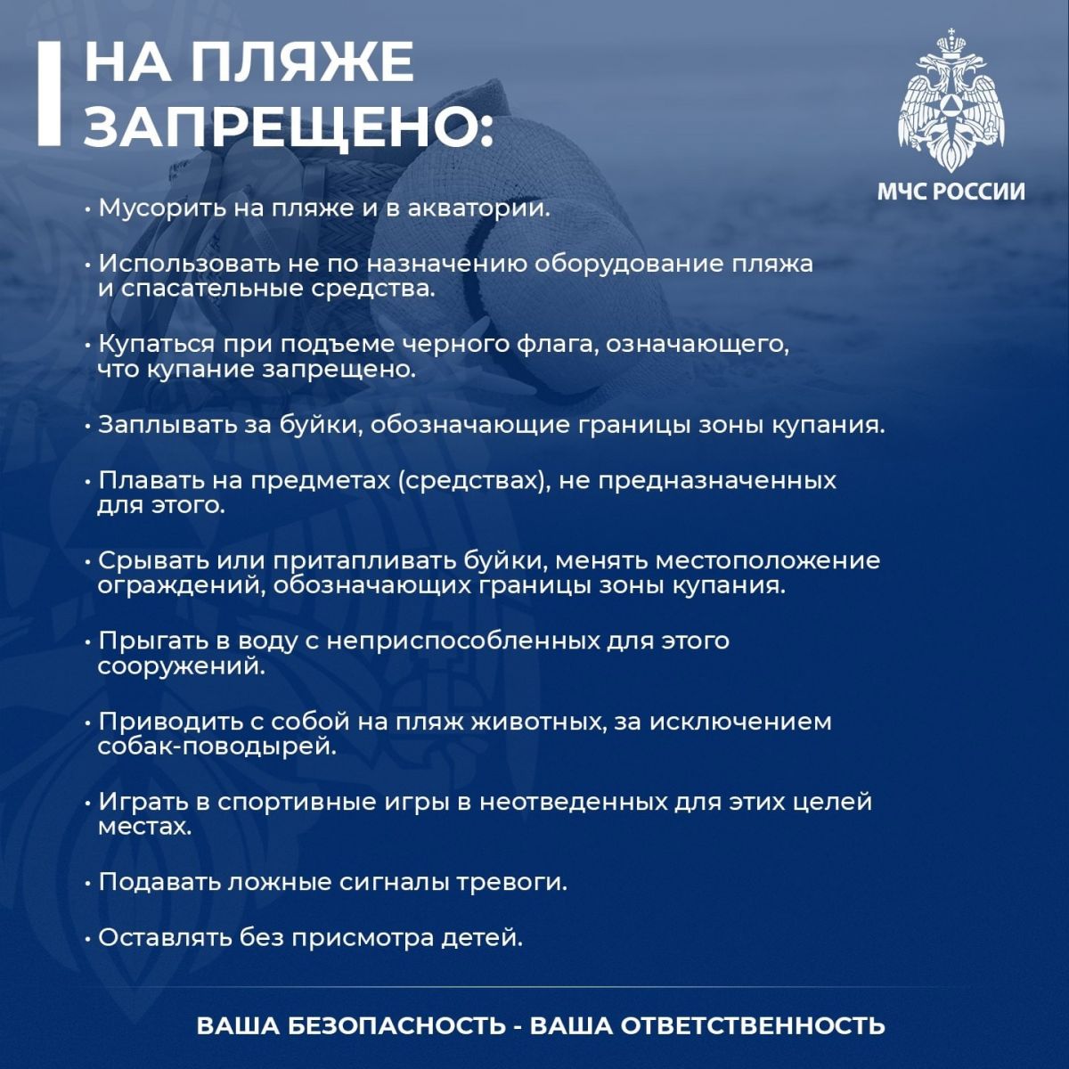 Детям нужно рассказать об опасности течения и водоворотов, игр в воде, связанных с захватами, а также плавания на надувных матрасах или камерах. Взрослым запрещается купаться в нетрезвом виде.