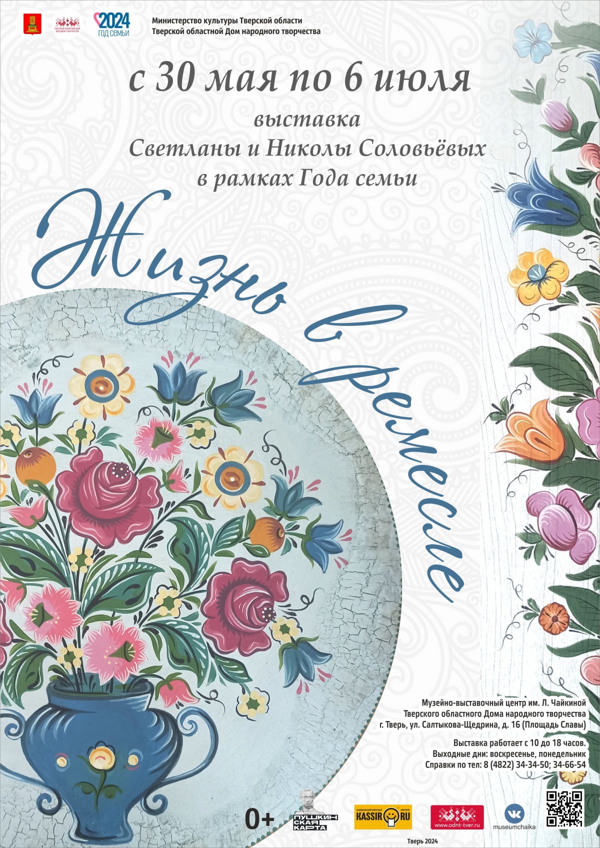 На выставке представлены работы известного тверского мастера Светланы Александровны Соловьёвой и её сына Николы. В экспозиции можно увидеть декоративные панно, художественный переплёт, роспись по дереву по мотивам валдайской, мезенской, городецкой, вологодской, пермогорской и хохломской традиций, глиняные игрушки и многие другие произведения декоративного искусства.